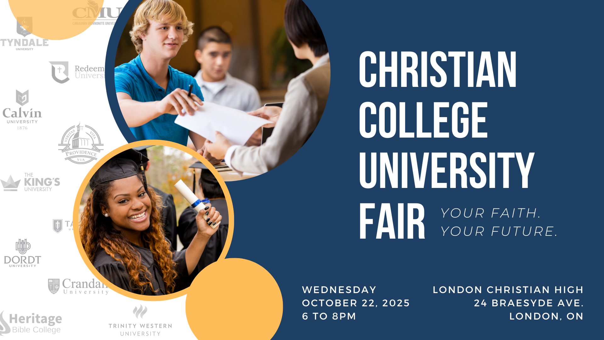 Join us at London Christian High on Wednesday, October 22, 2025, from 6-8 PM for our Christian College University Fair! Explore post-secondary options from leading Christian institutions such as Tyndale, Redeemer University, Dordt University, and more. Parents and students will have the opportunity to meet with representatives, ask questions, and learn about programs that integrate faith and academics. Open to everyone, we invite you to discover the next steps in your educational journey.